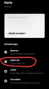 Mit dem neuen Crypto Saveback erhältst du die Option, bei Zahlungen mit deiner Trade Republic Visa Card 2 Prozent Saveback zurückzuerhalten. Hierfür musst du in der Trade Republic App zu deiner Visa Card navigieren und unter dem Fenster „Zahle mit“ die entsprechende Kryptowährung auswählen.