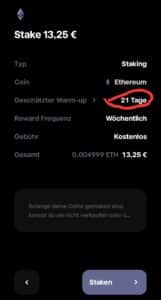 Aktivierst du die Staking-Funktion, durchlaufen deine Coins zunächst eine Warm-Up Phase. In diesem Zeitfenster werden deine Coins für die Teilnahme vorbereitet. Die Länge der Warm-Up Phase hängt von der Kryptowährung, der Netzwerkauslastung und dem Betreiber ab. Beim Validator Figment kann diese zwischen wenigen Stunden und einigen Wochen betragen. Die geschätzte Warm-Up Phase von Ethereum beträgt bei Trade Republic aktuell z. B. 21 Tage. Allerdings sprechen wir hier von einem dynamischen Wert, der sich jederzeit ändern kann.